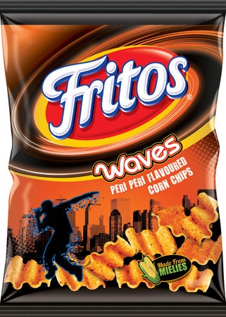 Peri Peri Waves are a type of corn chip made by Fritos and only available in South Africa. Crispy, with rippled waves/ridges, its unique texture allegedly adds to its flavor. It’s flavor is mildly hot, reported by some users to be not too strong or weak in flavor, and perfect for dips such as Salsa or Guacamole.
